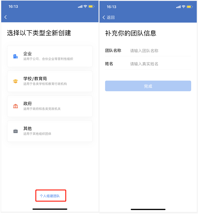 在手机端创建企业页面底部可以看见“个人组建团队”入口,点击后需补充团队名称以及注册人姓名,即可注册成功。