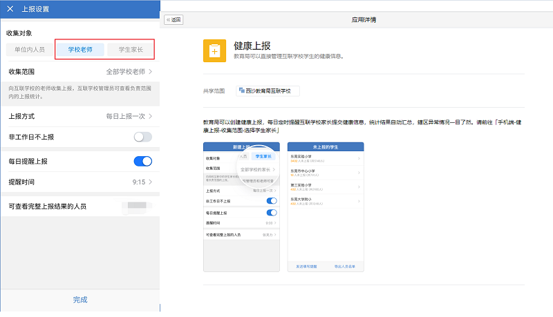 健康上报收集范围选择「学校老师」或「学生家长」,支持教育局向互联学校的「老师」或「家长」收集健康信息。