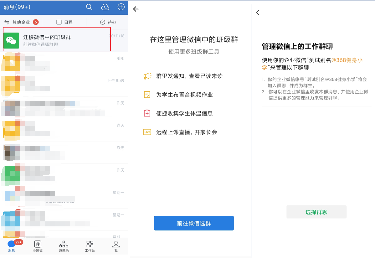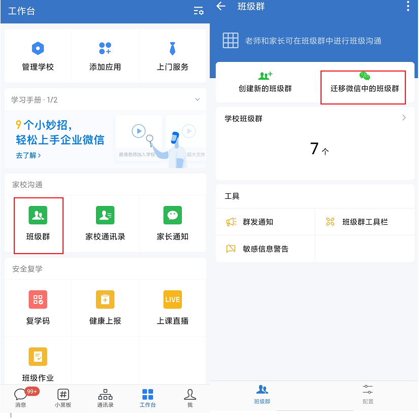 路径:会话页面中“迁移微信中的班级群”或者工作台-班级群-迁移微信中的班级群。