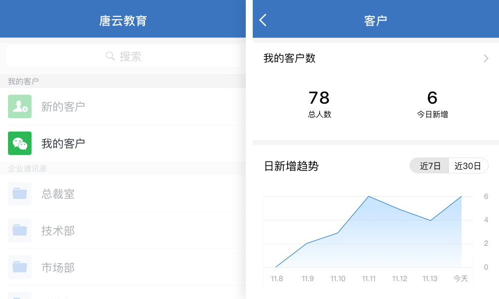 3、成员可在通讯录-我的客户中查看与联系自己的客户。还有统计功能,随时查看自己的客户总数和日新增。