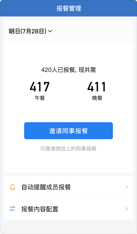 1、超级管理员、分级管理员可以在手机端[Android、iOS]和PC端[Windows]-工作台[报餐]应用-[报餐管理]查看当天对明日报餐收集结果的统计数据。并且支持切换到不同日期,查看历史收集统计结果。