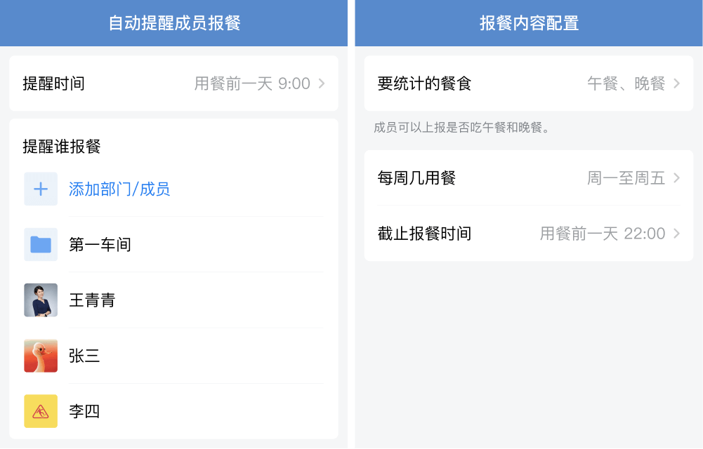 超级管理员、分级管理员可以在手机端[Android、iOS]和PC端[Windows]-工作台[报餐]应用-[报餐管理]进行配置或修改。包括自动提醒成员报餐、报餐内容配置(要统计的餐食、每周几用餐、截止报餐时间)。