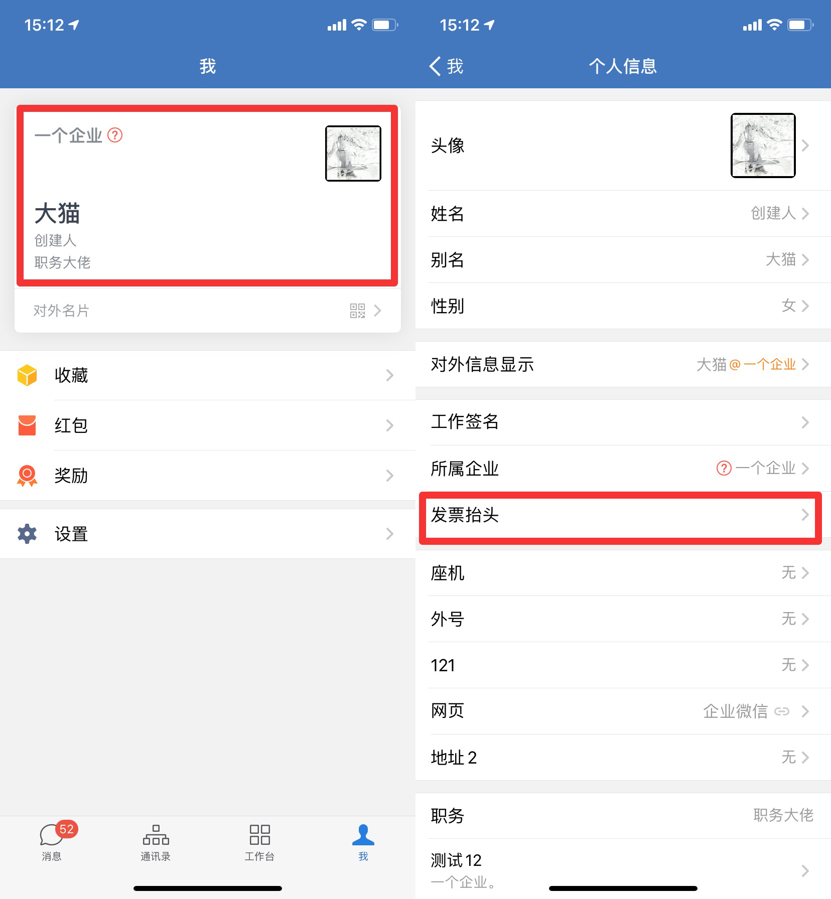 成员打开手机版企业微信—我—头像区域—发票抬头中查看使用。